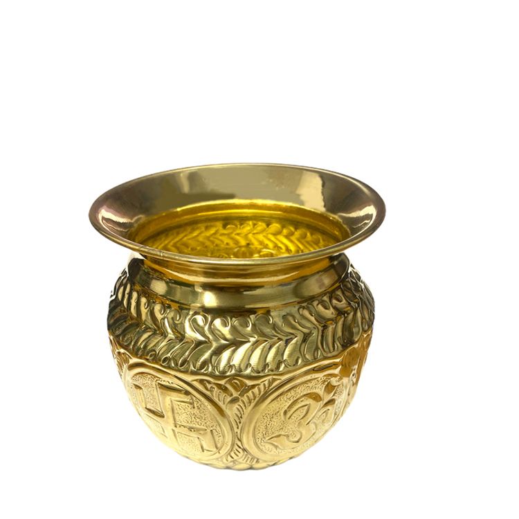 Beautiful Brass Lota With A Lotus Flower, Hindu Swastika and Om Symbols Around it.
