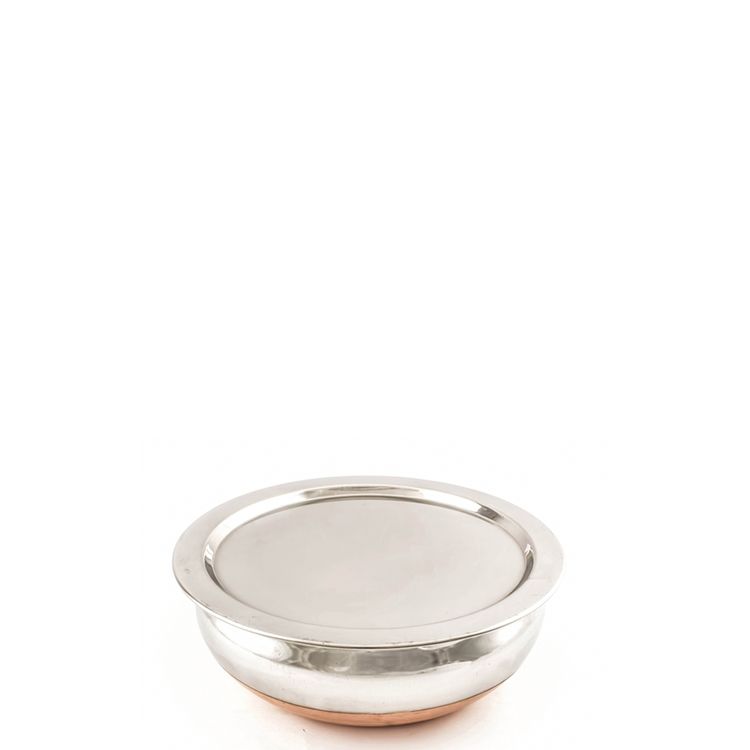 The copper based handi is used to serve curries but also can be put on the gas to cook with. The handi is stainless steel inside and outside with a copper plate to the base, which allow even heat distribution while heating. The dish comes with a flat stainless steel cover.