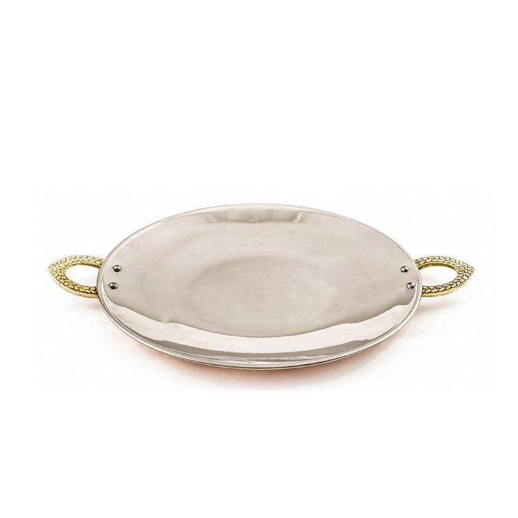 The Copper Tawa can be used to serve traditional dry starters and chaat's. The dish on the underside is finished with a copper hammered hand styled look with two brass engraved handles and on the upper side it is polished stainless steel for serving.