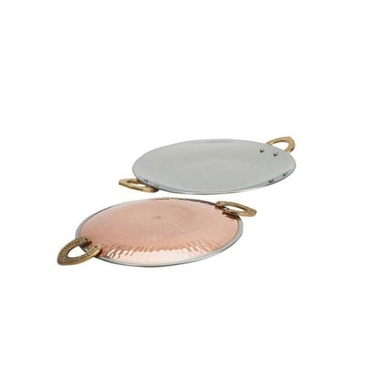 The Copper Tawa can be used to serve traditional dry starters and chaat's. The dish on the underside is finished with a copper hammered hand styled look with two brass engraved handles and on the upper side it is polished stainless steel for serving.