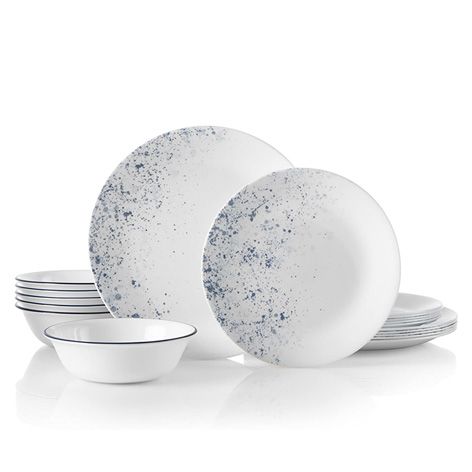 Corelle 18-piece Dinner Set, Indigo Speckle, Blue and White for 6, Chip Resistant Dinnerware, includes 26cm round dinner plates, 17cm round salad/side plates and 530ml round soup/cereal bowls.