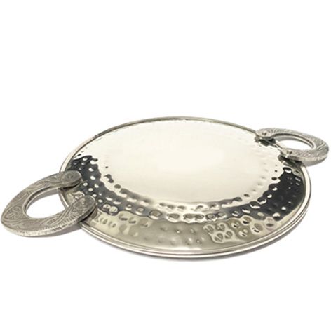 The Tawa can be used to serve traditional dry starters and chaats. The dish on the underside is finished with a hammered hand styled look, engraved handles and on the upper side, it is polished stainless steel for serving.