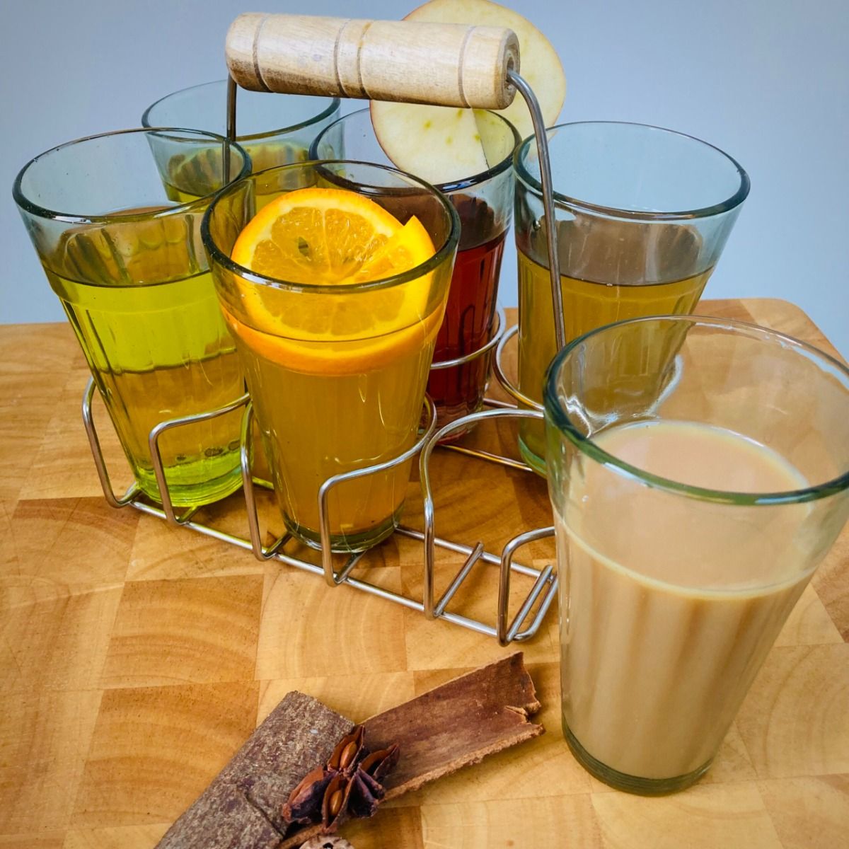 A stainless steel carrier for our indian mini Chai glasses and 6 chai glasses. Looks great when served to your guest on the table. Height stated includes handle.