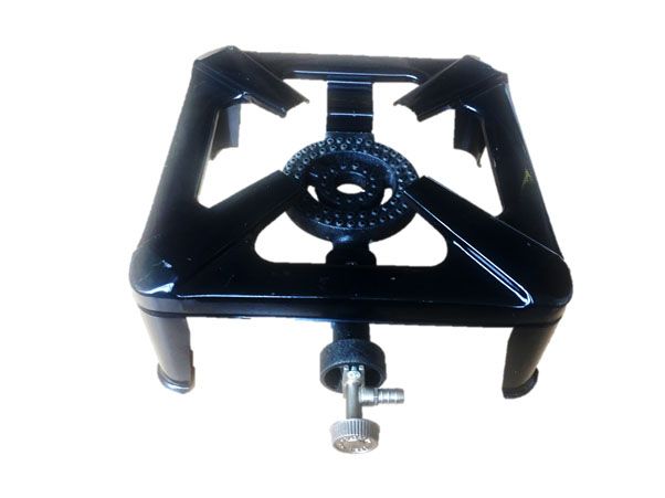 Large sheet steel stove with cast iron burner – Very High Output 7.5kW. Single burner boiling ring mounted in a sheet steel frame. Variable flame control with a maximum 7.5 kw output. Made to operate at low pressure with Butane or Propane. It is one burner with 2 ring.