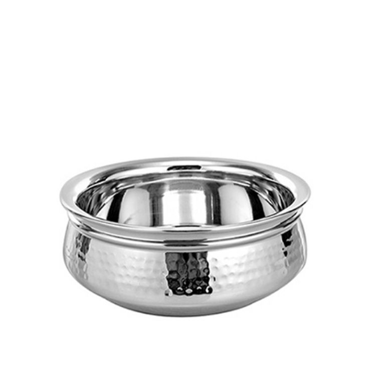 This hammered stainless steel double wall handi is used to serve traditional Indian Curries. This handi is a double wall finish with a hammered hand styled look with two handles.