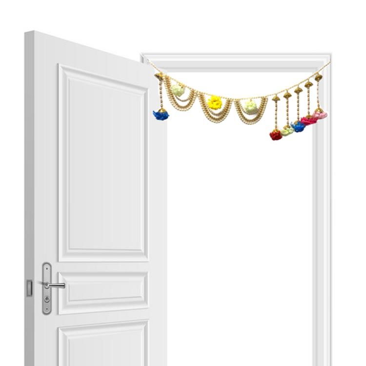 A Beautiful Toran With A Sting Of Golden And White Beads, With False Hanging Flowers.
