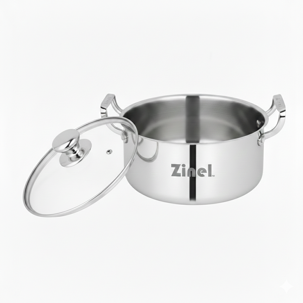 Zinel Tri-Ply stainless steel cookware is made of three layers of material that ensures even heat distribution, reduces cooking time and less chances of burning; resulting in great cooking results.